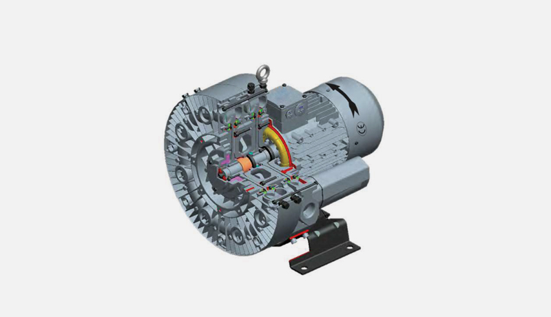 Blower erhöhen den Druck des eingesaugten Gases durch eine Reihe von Wirbelbewegungen, die durch die zentrifugale Bewegung des Rads entstehen. Während sich das Rad dreht, drücken die Kanäle im Rad die Luft mit einer zentrifugalen Bewegung nach vorne und es entsteht eine spiralförmige Bewegung. Während dieser Bewegung wird das Gas kontinuierlich komprimiert und der Druck steigt linear an. Der verdichtete Luftstrom wird durch den Auslasskanal des Blowers in die Anlage übertragen.